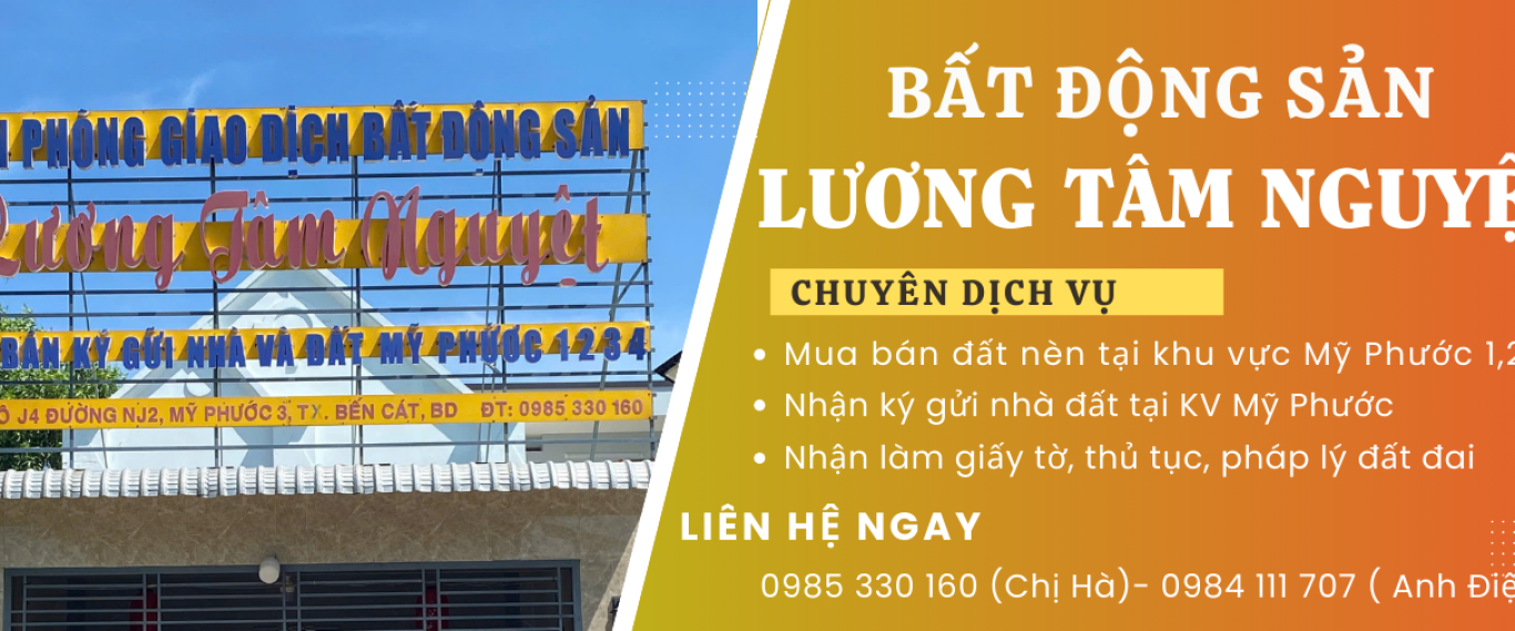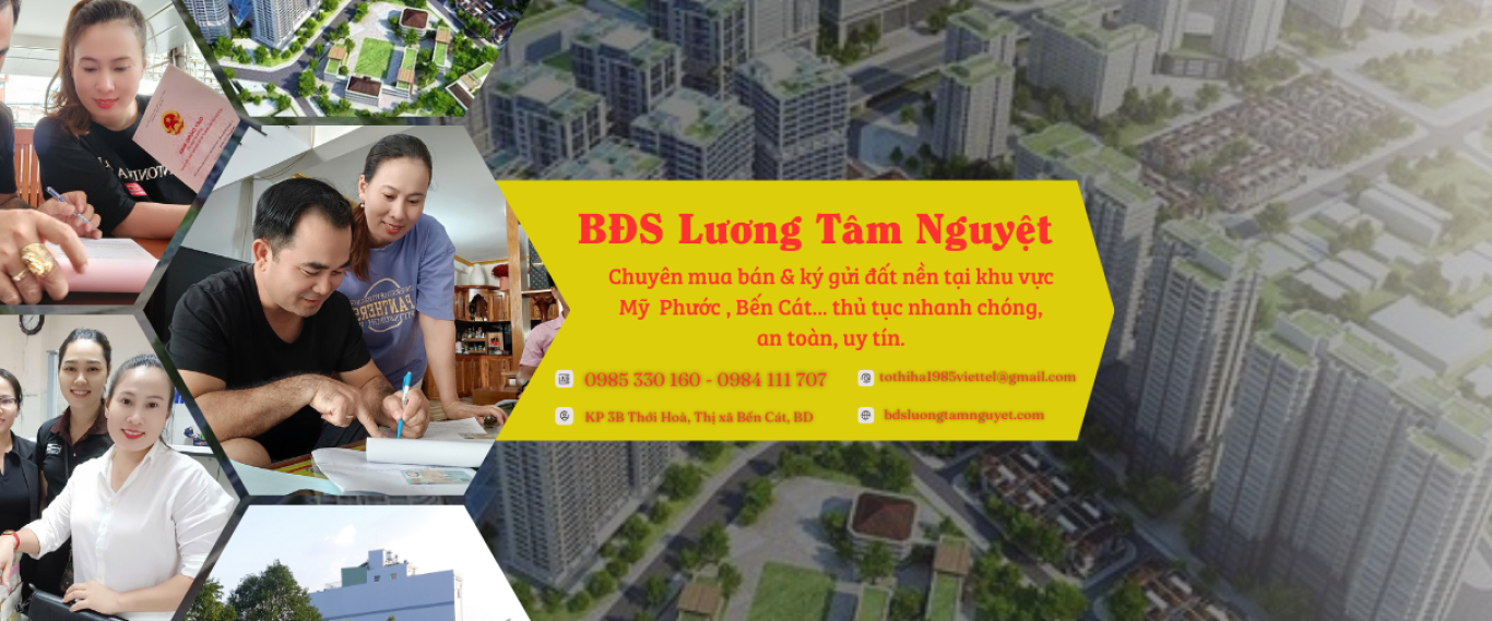 BĐS Lương Tâm Nguyệt chuyên cung cấp dịch vụ mua bán BĐS uy tín tại khu vực Mỹ Phước, Bến Cát,... Thủ tục nhanh chóng rõ ràng.